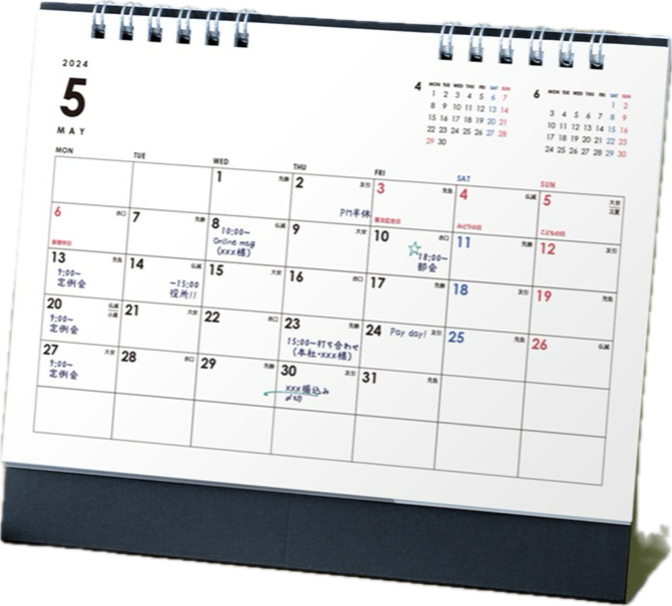 裏面は月毎のブロックカレンダーとなっています。スケジュールなどを書き込んでいただけます。