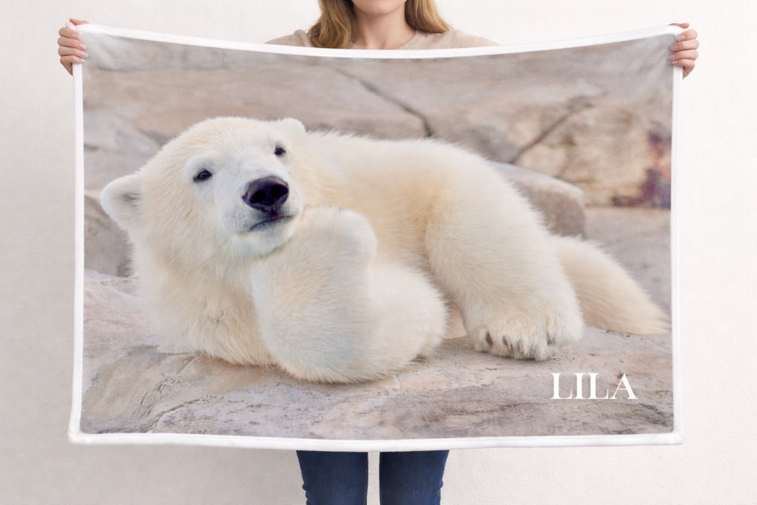 考えるホッキョクグマのリラの考えるリラポーズデザイン、ソフトフリースブランケットです。