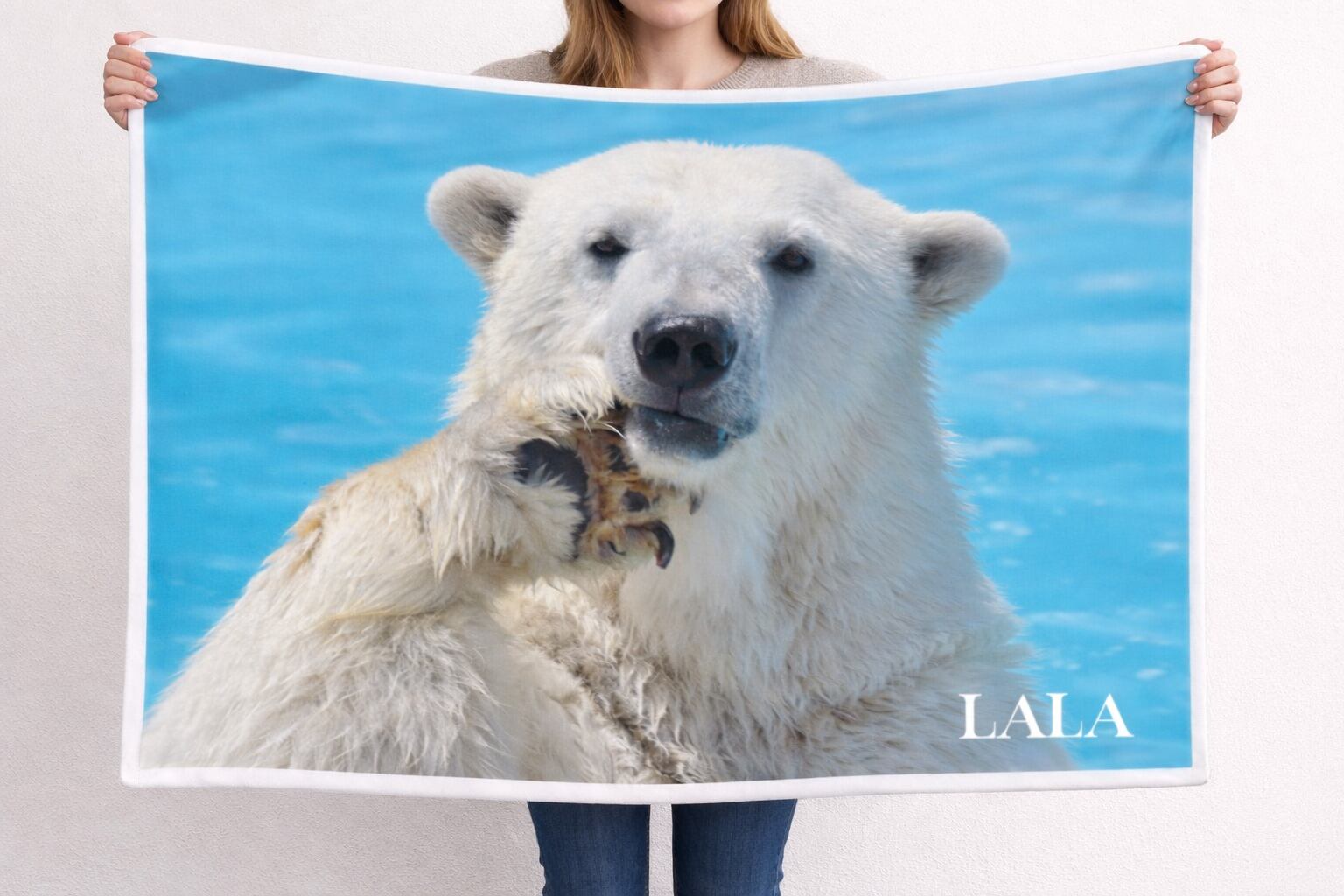 ほっちーポーズをするホッキョクグマのララ・デザイン、ソフトフリースブランケットです。