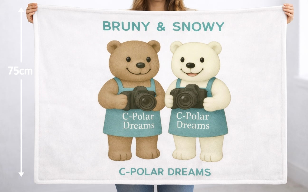 C-Polar Dreams のマスコット Snowy & Bruny が一眼レフを持ったデザインのソフトフリースブランケットです。