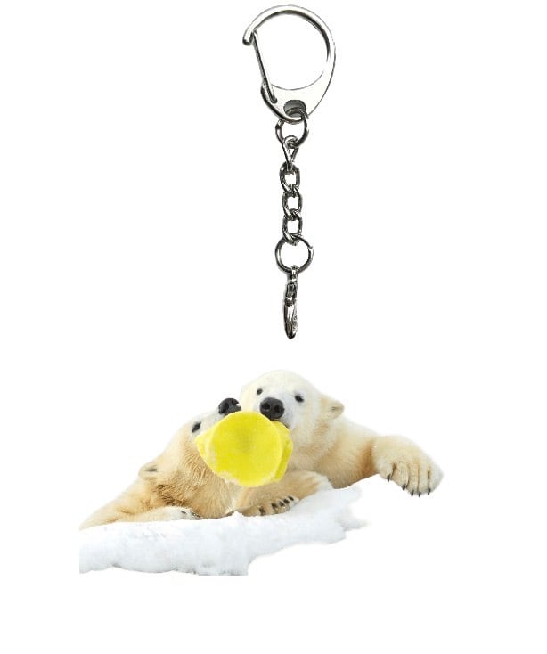 たくわん!?みたいなオモチャを取り合って遊ぶホッキョクグマのイコロとキロルのアクリルキーホルダーです